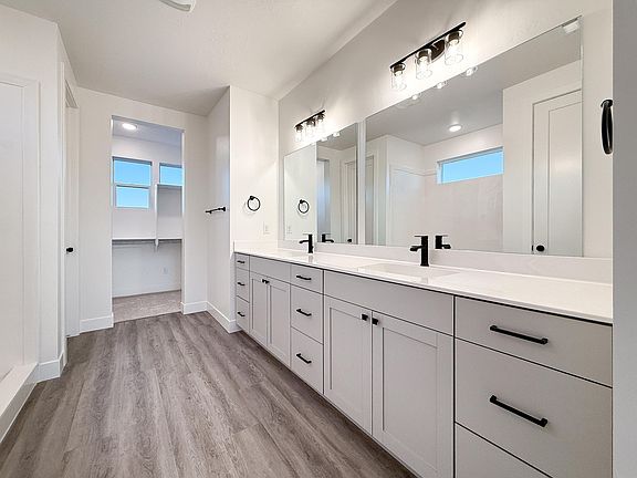 Dual vanityModern prairie exteriorLarge kitchen islandAgreeable-gray cabinetsPrimary suiteLarge walk-in showerSpacious open-concept living