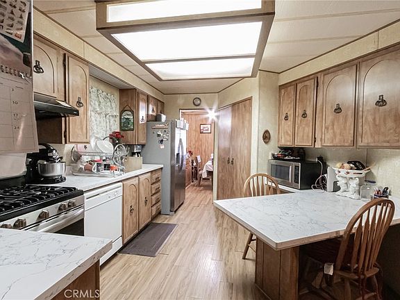Discover serene living in the sought-after Hillcrest 55+ community in Yucaipa. This beautifully maintained home offers breathtaking mountain views, perfect for sipping your morning coffee in the sunroom. Step inside to find a thoughtfully updated kitchen, complete with sleek quartz countertops, a brand-new refrigerator, and a state-of-the-art stove/oven featuring an air fryer option. The primary bathroom has been equipped with a safe and accessible walk-in shower/tub, designed with your comfort in mind. Enjoy added convenience with an extra storage bar area featuring a butcher block counter. Outside, you'll find a convenient shed for additional storage, ideal for keeping your tools and outdoor gear organized. The community boasts a range of amenities, including a clubhouse, pool, spa, and billiards, along with a variety of social activities. Plus, you're just moments away from Yucaipa's delightful restaurants and events. Come experience the tranquility and convenience of Hillcrest living—schedule your visit today!
