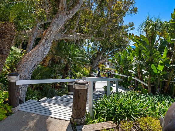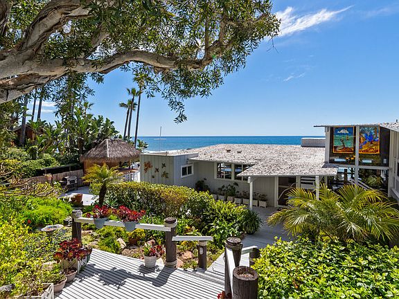 A private tropical paradise, this Western Malibu mid-century beachfront home is offered for lease for the first time. Magnificent palms, enormous window walls, expansive decks, and sensational views create an away-from-it-all atmosphere. The well-maintained interior is detailed with wood, including wood ceilings, Saltillo tile, and built-in shelves and cabinets characteristic of mid-century design.Known as Watkin's Cove, the terraced cul-de-sac property steps down from an upper-level two-car garage. A beautiful walkway meanders through lush gardens and terraced lawn areas, with a creek, a small pond, and a fountain.The ocean is on view from the moment you step into the foyer. Ahead is the spacious living room, with wraparound windows, fireplace, and a brick hearth that extends the length of one wall as a window seat. Adjoining the living room is a great room that comprises a top-quality kitchen, dining area, and bar, plus a pantry. With floor-to-ceiling windows on two sides, this large room opens onto a huge, wraparound, multi-level deck complete with a tiki hut bar, barbecue and dining area, and ample room for lounging and entertaining overlooking the beach, coastline, ocean, and island views. There is also a powder room on this level.The lower level has three bedrooms plus a recreation/media room, while the upper level has three more bedrooms, including the primary suite, which has gorgeous panoramic ocean views.The home offers wonderful settings for indoor-outdoor entertaining, including a peaceful front yard with ocean views, decks on two levels, lawns surrounded by flower gardens, and a wide stairway leading to the quiet, sandy beach below. A rare Malibu treasure.
