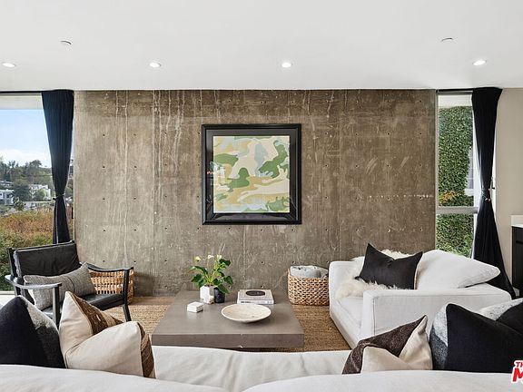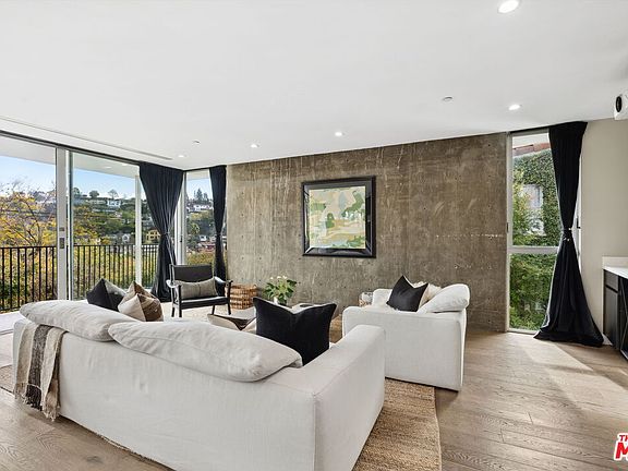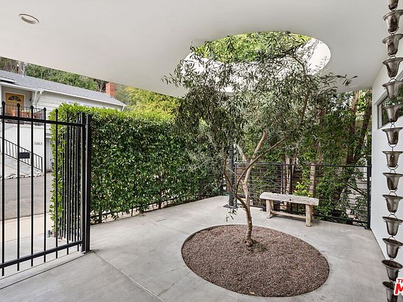 Presenting a stunning, contemporary residence in the sought-after Hollywood Hills, expertly crafted by RCDF Studio and Rogerio Carvalheiro. This sleek and functional architectural gem features a fully open floor plan on the entry level, elegantly accented with wood floors throughout. The kitchen is a chef's dream, featuring custom cabinets, high-end appliances, marble countertops, and a center island that doubles as a breakfast bar and focal point. The living and dining areas seamlessly flow together, highlighted by an east-facing wall of glass that opens to a terrace spanning the width of the house. Here, you can enjoy a movie with use of a built-in theater projector, verdant canyon views and a peek at the iconic Hollywood sign. The first floor also includes a convenient powder room. Descend to the lower level to find a well-appointed primary bedroom complete with a walk-in closet and luxurious bath with heated floors. A second bedroom, hallway bath, and laundry closet complete this level. The property boasts a variety of fruit trees, including olive, lemon, and lime, and a custom backyard patio that creates a tranquil and private retreat. Additionally, there's a studio flex space that offers versatile usage options. Located in a prime area with easy access to studios, freeways, and the valley. Welcome home to this gem.