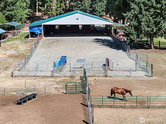 Welcome to Black Diamond Ranch. Huge income potential! This reimagined NW lodge-style estate w/a wall of windows & a wraparound porch. Cherry floors, soaring open-beam ceilings & kitchen showcasing ILVE 40" gas range sporting side-by-side double ovens +custom copper range hood & pantry. Rare main floor primary suite delivers a fireplace, ensuite & deck access. 3 addt'l bdrms, den & huge family rm. Horse lovers or buyers looking for nearly flat, usable land, this place is next level: partially covered 70'x220' arena w/viewing area, 4 stall barn, hay storage, 3 stall barn, multiple paddocks, pastures & boarding potential. Oversized shop & ample parking!