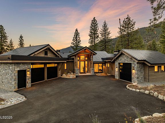 This stunning newly built Clear Creek Tahoe residence seamlessly blends modern mountain luxury with timeless design, offering an exceptional living experience within one of Nevada's most exclusive gated communities. Set on a serene homesite with unobstructed mountain views, this 4,469 sq. ft. masterpiece features four bedrooms, an office, and four and a half baths, including three ensuite bedrooms that provide comfort and privacy for family and guests. The open-concept great room welcomes you with soaring ceilings, a Taj Mahal leathered quartzite-wrapped fireplace, and expansive glass doors that create a seamless indoor-outdoor connection to the covered patio. The chef's kitchen is a true centerpiece, showcasing high-end appliances, quartzite countertops, a large island with seating, and a custom wine rack for the connoisseur. Elegant porcelain tile entry floors transition into herringbone oak flooring that flows throughout, enhancing the home's warm and sophisticated aesthetic. Designed for entertaining, the home features two wet bars with wine refrigerators and a cozy reading nook for quiet moments. Outdoor living is equally impressive, with a built-in BBQ, fire pit, and hot tub, all perfectly positioned to capture the breathtaking alpine scenery. A 3.5-car garage provides ample space for vehicles, gear, and storage. Residents of Clear Creek Tahoe enjoy access to world-class amenities, including the Coore & Crenshaw-designed golf course, an inviting clubhouse for dining and social gatherings, and the Twin Pines Lake & Ski House on Lake Tahoe's shore with private beach frontage. Additional amenities include guest cottages, Summit Camp with a pool, bocce and pickleball courts, cozy fire pits, and family-friendly recreation areas—creating the ultimate year-round retreat. This home presents a rare opportunity to own a newly built mountain retreat that perfectly balances elegance, comfort, and modern design in one of Nevada's most coveted settings.