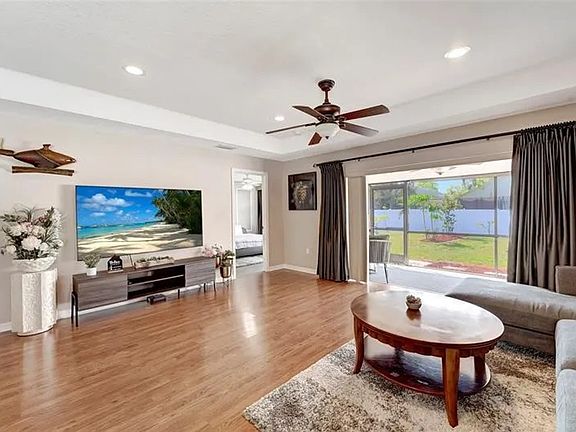 Fenced yardModern finishesScreened lanaiHigh ceilingsSplit floor planLaminate and vinyl flooring