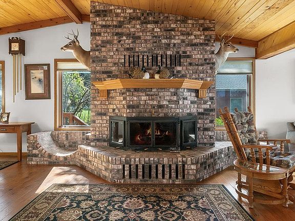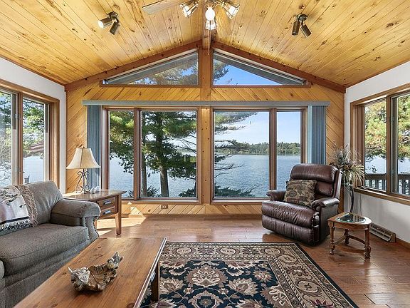Sleek solid-surface countertopsClassic brick wood-burning fireplaceLaundry on both floorsPanoramic lake viewsBeautiful waterfront viewsSoaring tongue-and-groove vaulted ceilingsSummer kitchen