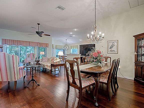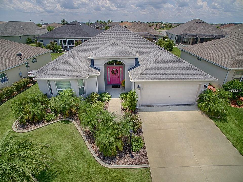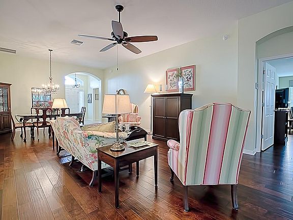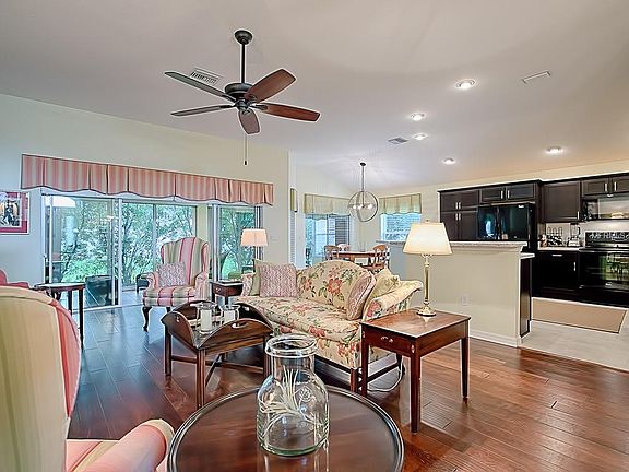 This is an IMMACULATE Designer LILY, in the popular VILLAGE of CHARLOTTE! This lovely home has been enhanced with WIDE-PLANK WOOD FLOORING in the living areas and bedrooms, and tile in the kitchen, baths, and utility room. The kitchen features high-definition counters that have the appearance of beautiful marble. The JAVA cabinetry has crown moulding and stainless hardware which create a stunning backdrop for the black appliances. Appliances include a side by side refrigerator, glass-top electric range, dishwasher, and a space-saver microwave. A convenient breakfast nook for casual dining is highlighted by a unique, globe light fixture! The OPEN CONCEPT living and dining rooms are spacious, with an upgraded ceiling fan in the living area. The master bedroom suite features a trey ceiling, large walk-in closet and a master bath with DUAL SINK VANITY, separate W/C with pocket door and a ROMAN SHOWER. The guest area is separated with a pocket door and offers two comfortable bedrooms (both with closets) and a guest bath with a tiled tub/shower. The GLASS-ENCLOSED lanai is CLIMATE-CONTROLLED and features a tiled floor and sliding windows with vertical blinds! Lush landscaping creates a private retreat in the lanai! The utility room has built-in cabinetry, and a laundry sink. Additional enhancements include hand-finished ceilings, a coat closet in the entry, and planting beds filled with mature, tropical landscaping! This is a lovely home, located in a SUPER CONVENIENT location within The Villages.