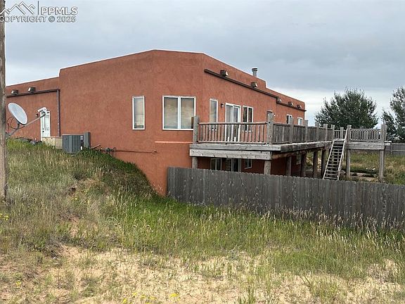Discover the charm and potential of this beautiful Hacienda-style home, set on 80 peaceful acres of open Colorado countryside. The living room showcases classic log vigas and large windows that fill the space with natural light and views of the surrounding landscape. Enjoy the convenience of single-level living with the primary suite, kitchen, dining, and laundry all on the main floor, in a spacious and inviting layout. The lower level offers quiet, comfortable space with Owens Corning walls, a large storage area, rough-in bath, and an office that could easily become a fourth bedroom. Some areas are ready for your finishing touches, allowing you to make this home truly your own. Step outside to a full-length custom deck crafted from hand-cut lumber and tree trunk posts, a shaded patio below, and a tranquil waterfall feature at the front. The 40x60 barn/outbuilding and fenced acreage are ideal for horses or hobby farming, and a 13KW generator provides peace of mind. With a little TLC and vision, this property can shine once again. Just 25 minutes from Falcon — country living at its best, with room to make it your own.