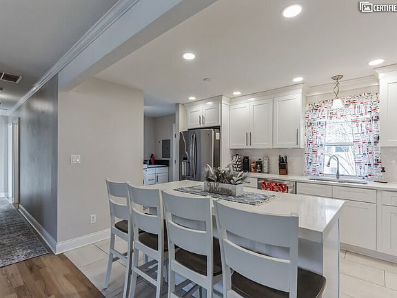The kitchen is open plan, with traditional elements, quartz countertops, and necessary cooking amenities. There is an island that can seat 6-8 guests. A laundry area is situated in an open room next to the kitchen with door leading to the backyard and deck.