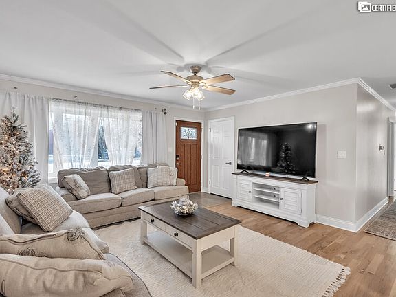 Indoor amenities include ceiling fans in every room, ensuring a comfortable and inviting atmosphere. The living room features a sectional couch, coffee table, and a smart TV, perfect for lounging and relaxing. Hardwood flooring throughout the house adds a classic and cozy touch to the space.