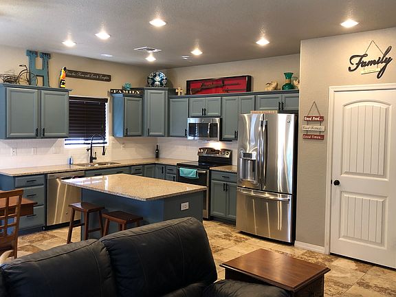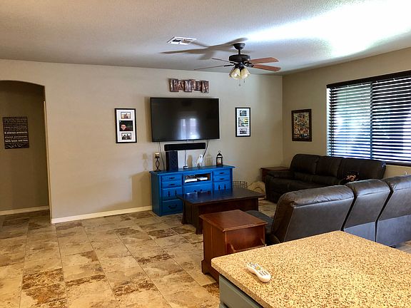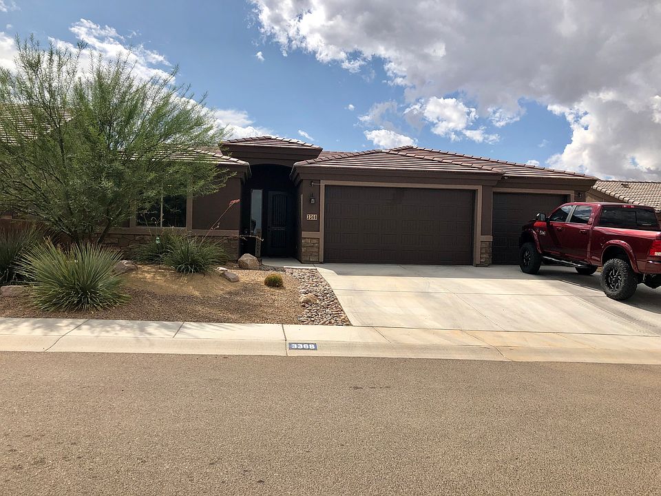 Beautiful 4 bedroom home in Hualapai Shadows with 3 car garage and RV parking! This home offers 1,706 sq ft of living space, open floor plan and NO CARPET! Other important features and upgrades include: *Fully landscaped with rock, matures shrubs and grass on watering system *Stone accents *Tile roof *Upgraded 50 gallon water heater *Water saver toilets *Soft water system *Motion lights throughout *Ceiling fans *Custom faux wood blinds *LED lighting *Casual dining *Kitchen island *Granite counter tops *Subway tile back splash *Double oven *Kitchen pantry *Split bedrooms *Upgraded Luxury vinyl in bedrooms *Master suite with walk-in closet, upgraded barn door, dual sinks and walk-in tile shower *Sizable guest bedrooms with full bath *Indoor laundry room *10x20 back patio extension *Hot tub *Block wall fencing *12x12 utility shed. This property is located in a highly desired subdivision and features views of surrounding mountains and sunsets!