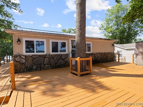 THIS HOME HAS GREAT BONES! ALL THE WORK HAS BEEN DONE FOR YOU TO WALK IN AND ADD YOUR PERSONAL TOUCH! Welcome to your year-round Lake of the Ozarks retreat! Located on Deep Water and featuring a new metal roof (2022) ,NEW 12,000 lb boat lift, upgraded foundation! Situated on a separate parcel is your insulated 1,900 sq ft climate controlled 4-6 car garage with 2 NEW MINI SPLITS ,and a finished 17 x 11' living quarters—ideal for guests, a hobby space, or extra storage. Located on a quiet dead-end street in a lovely neighborhood, this home offers a cozy interior, large level front yard, and plenty of parking in front and at the garage. Inside, enjoy a comfortable layout perfect for full-time living or weekend getaways, with space to relax and entertain. Step out onto the expansive lakeside deck to take in breathtaking views or head down the tram or gentle steps to the private dock, complete with a swim platform and 2-well DOCK extended to 12 x 34' and 10 x 26' slips. With thoughtful upgrades and ideal outdoor living spaces, this property is the perfect blend of comfort, convenience, and lakefront lifestyle. SELLER NOW OFFERING 7500 IN CONCESSIONS FOR UPDATING!