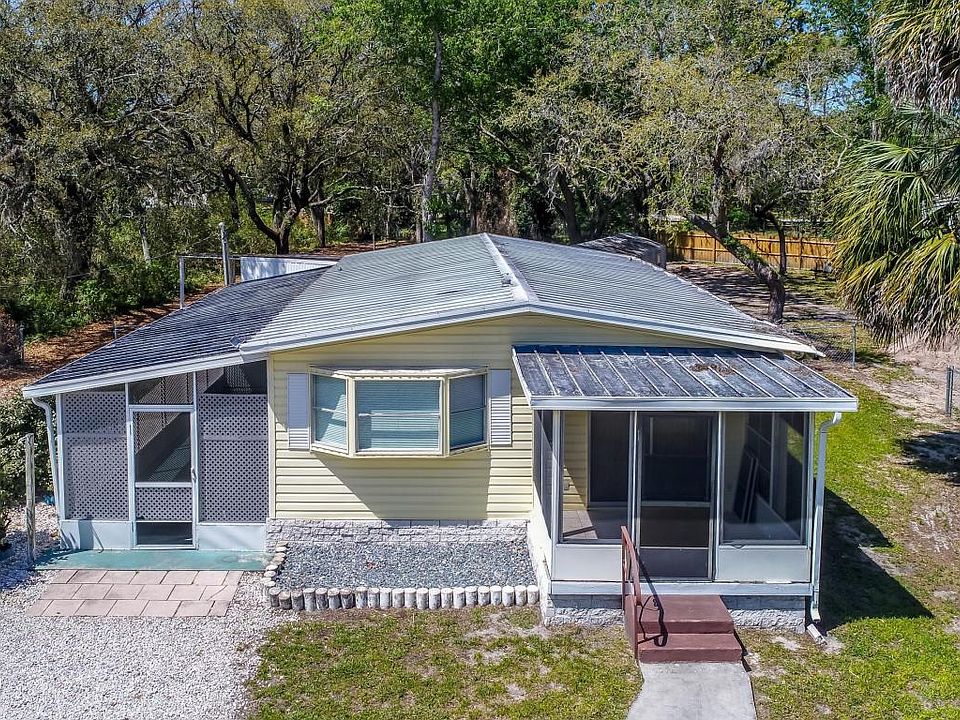 Fantastic opportunity to own this move in ready 2 bedroom 2 bathroom home with two screen enclosed patios. This property sits on almost a half an acre with two separate workshop/sheds (perfect for a Man Cave and a She Shed) plus a fire pit. Mature landscaping gives it a private retreat feel. As you walk in you are greeted by a large, light and bright, open kitchen. Living room has sliding glass doors to second patio. Carpeting is only 1 year old and in great condition. Master bedroom has a big walk-in closet, open sink vanity area for getting ready and large walk in shower. Fencing on the north side of the property is in the works and will be completed prior to closing. Be sure to check this property out before it is gone!
