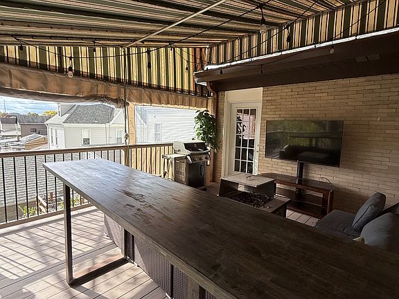 The rear deck comes fully furnished, including: grille, couch, TV with stand, rear bar height table, and fire table (which cannot be moved due to gas line).