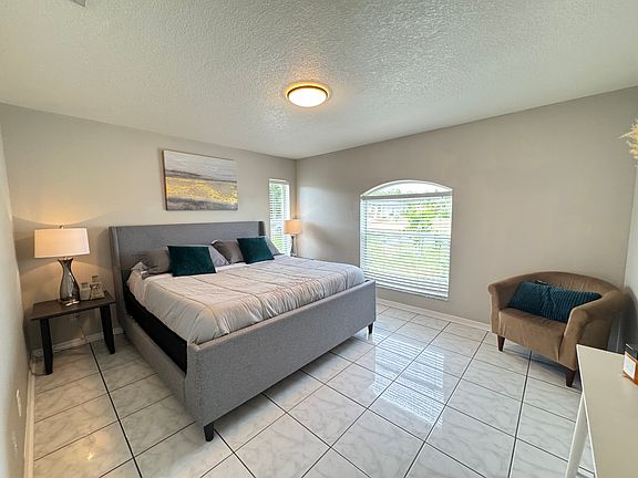 This home sits in a beautiful and quiet neighborhood. Unit backs up to a canal and has a large, curved driveway with courtyard & lots of parking. This is an almost 1200 sq, ft. End unit in a triplex complex. It offers vaulted ceilings great room with plenty of windows, comfortable sectional couch and flat screen TV, open concept kitchen with large walk-in pantry, dining table that sits 4 comfortably, fridge, dishwasher & stove and microwave. Kitchen is fully stocked with everything you need to make that gourmet dinner. Front lanai is screened furnished with relaxing sectional couch. Large master suite with walk-in closet King bed and separate bathroom with a shower/tub. The second bedroom is on the opposite side with a large closet 2 twin beds and a desk. Laundry room with washer & dryer and all the beach accessories.