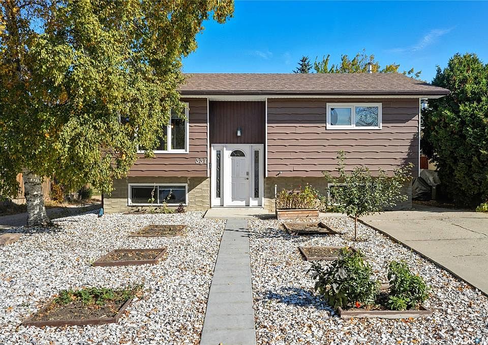 Welcome to 337 Brock Crescent, a beautifully maintained bi-level home nestled in the heart of East College Park — one of Saskatoon’s most desirable, family-friendly neighbourhoods! Perfectly situated on a quiet corner lot surrounded by mature trees, this charming residence offers both privacy and convenience, just steps away from St. Augustine School, parks, and playgrounds. From the moment you arrive, the curb appeal stands out with its clean, low-maintenance front yard featuring crushed stone landscaping, flower beds, and a mix of wood siding and stucco for timeless charm. The staggered single driveway provides extra parking space. Inside, a bright and inviting atmosphere awaits. The main level opens to a sunlit living room with southwest-facing upgraded windows and soft carpeting, leading to a dining area with direct access to the large elevated deck — perfect for family dinners and summer BBQs. The kitchen is thoughtfully designed with maple hardwood cabinetry, linoleum flooring, and appliances including a stove, fridge, dishwasher, microwave, and hood fan. The sink overlooks the backyard, giving you a serene view while cooking. The main floor also features a comfortable primary bedroom, a second bedroom, and a stylish four-piece bath with tile flooring and quartz countertops. Downstairs, the fully developed basement extends your living space with a spacious family room, an additional bedroom, a three-piece bathroom, and a convenient laundry area with front-load washer and dryer. Comfort is enhanced with central A/C, a humidifier, and a 100A electrical service. Step outside to a private entertainer’s paradise: a huge 20.8’x18’ deck, gazebo, BBQ hookup, and hot tub-ready electrical setup. The detached single garage features a Wi-Fi door motor and gas line for a future heated upgrade. Backing onto a peaceful dog-walking trail, this home perfectly balances comfort, practicality, and outdoor enjoyment — move-in ready and waiting for its next happy family!