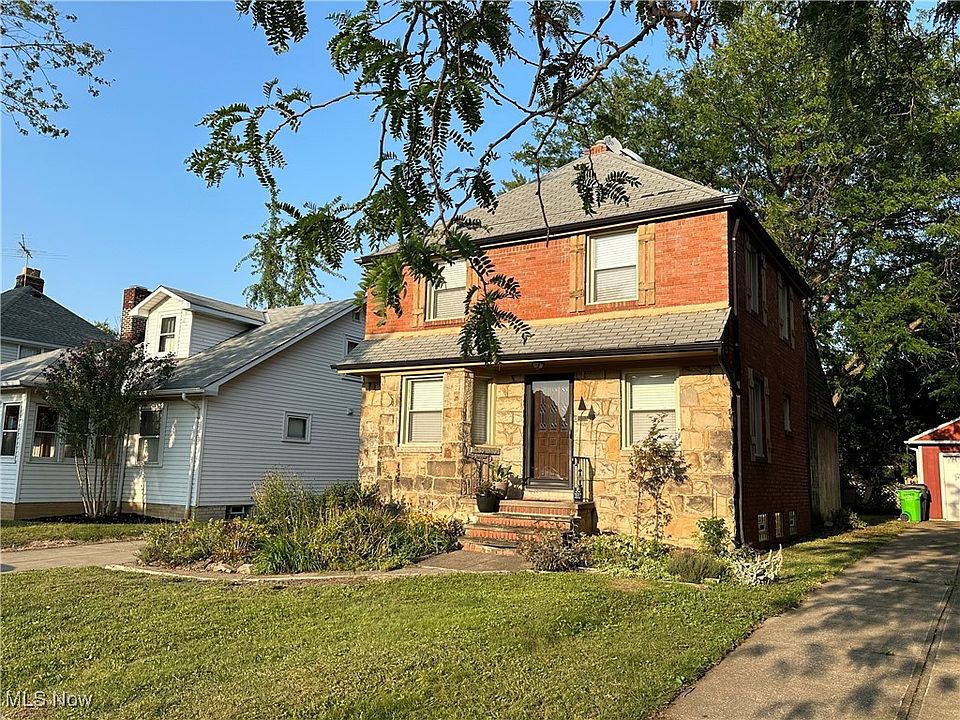 Make this brick and stone Tudor-style home on a quiet street your own! The family room addition features high ceilings and a wood-burning fireplace. Step up into the kitchen with all appliances and generous cabinet space. The dining room and living room feature a bay window and plenty of natural light. Upstairs, you'll find two bedrooms with great closets and a charming full bath. The primary bedroom features 3 windows - one with a window seat with storage AND 3 closets! This home also includes a partially finished basement with laundry and quarter bath. Exterior of the family room addition & the garage were freshly updated & painted this fall. The lot has multiple perennial beds and mature shade trees. The garage was built as a 2 car garage but was converted years ago to a 1 car + workshop. Could be converted back. Schedule a showing today!