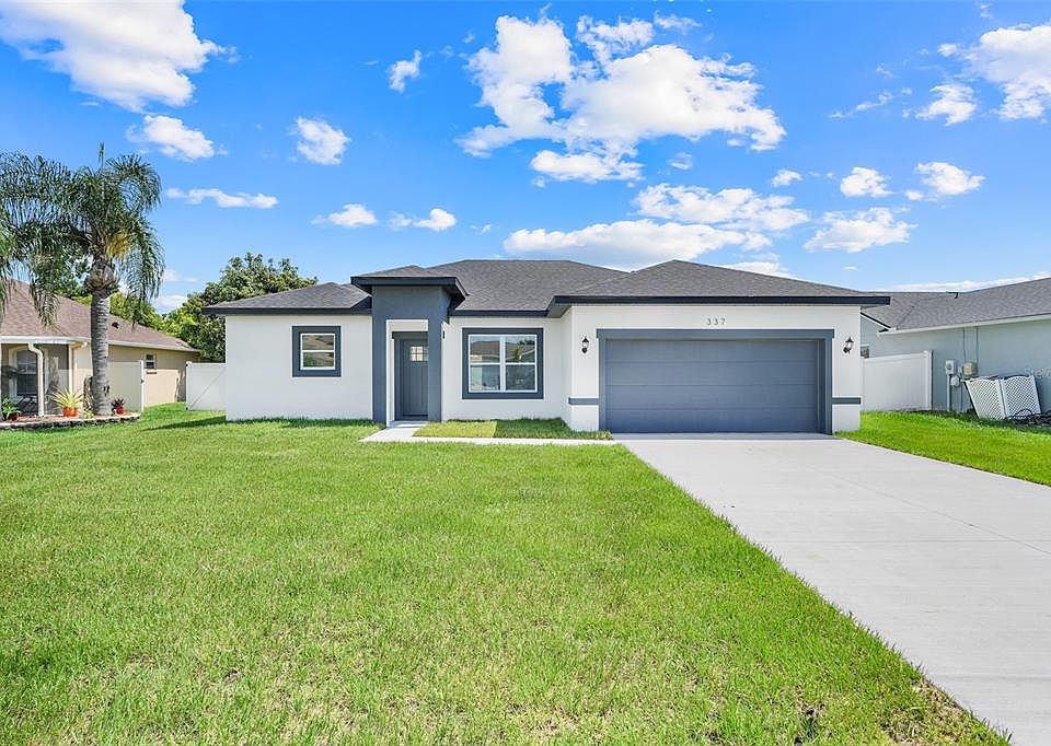 Inquire about DOWN PAYMENT ASSISTANCE. Stunning NEW-CONSTRUCTION home. 4 bedrooms, 2.5 bathrooms. This home blends clean modern style with practical comfort. Bright kitchen with stone countertops, stainless appliances, wall mounted faucet over the oven, and a large island perfect for entertaining. Spacious primary suite with DUAL WALK-IN CLOSETS and a luxurious en-suite bath with big shower, soaking tub and double vanity. OVERSIZE BACKYARD with plenty of room for a pool, garden, or play area. Two-car garage, finished EPOXY floor. Closable laundry room. HALF-BATH next to kitchen. Great LOCATION right off Marigold Ave and Cypress Pkwy, minutes away form Poinciana Pkwy, close to schools and shopping.