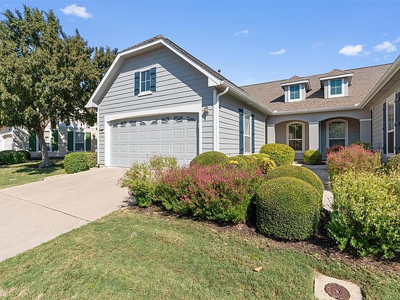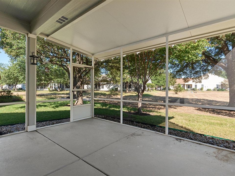 A jumbo Screened Porch overlooks a greenbelt dotted with native trees at this choice Sun City Texas Monterey Cottage (one/half duplex) near myriad activities of the Village Center. After greetings from a separated Front Sitting Porch, a nine-light door welcomes you inside. Here a boxed-window Breakfast Room also makes a cheerful Study area, while the adjacent Open Kitchen touts classic white upgraded appliances including gas cooking in this heart-of-the-home designed with a perfect work triangle. A Breakfast Bar gently separates the Kitchen from the Dining portion of the spacious Great Room, where twin windows overlook the wide and landscaped side yard and crown molding rims the nine-foot ceilings. Easy-care luxury vinyl plank floors blanket the Great Room viewing the roomy Screened Porch and the adjacent greenbelt. Those same floors continue into the separated Primary Bedroom, where a trio of dressed windows in this king-sized room view the awaiting greenbelt and a breezy fan provides added comfort. Meanwhile, the en suite Primary Bath hosts a roomy shower, dual vanities and a generous Walk-In Closet. At the front of the home the separated Guest Bedroom views the beforementioned Front Sitting Porch and the nearby full Guest Bath includes a Linen Closet. Off the boxed-windowed Breakfast Room the Laundry is complete with washer & dryer, while a high transom window grants natural lighting to the space. More well-placed windows illuminate the Two-Car Garage. Lock & leave the yard work for others, as this home is located in a maintained lawn neighborhood, where the stated annual dues include year-around lawn care. With its thoughtful upgrades and superior location, this is a home to add to your short list.