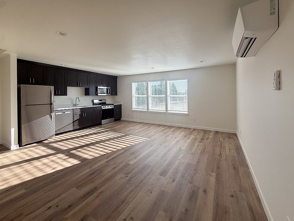 This top-floor studio ADU home features a welcoming kitchen equipped with stainless steel appliances, including a refrigerator, stove/oven, dishwasher, and microwave. The spacious floor plan offers a great room concept for living and dining, a tall pantry cupboard, and abundant natural lighting. Additionally, the unit includes a full-size stackable washer/dryer, and beautiful finishes such as granite counters and sleek cabinetry.