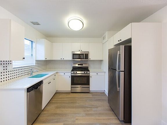 Pleasant courtyardUpgraded modern cabinetsRetro backsplashVinyl plank flooringStainless steel appliances