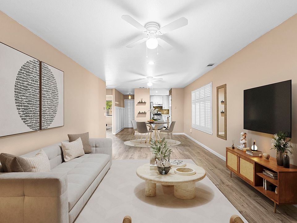 Tiled fireplaceCommunity poolPrivate one-story end unitInviting open layoutFilled with natural lightConvenient in-unit laundry room