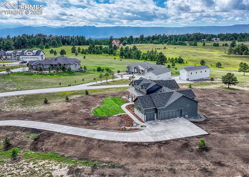 Brand-new custom home in Rollin’ Ridges offering over 5,100 square feet, 5 bedrooms, 5 bathrooms, and exceptional design. Completed in September 2025, this residence blends modern efficiency with timeless craftsmanship, set on a 2.5-acre cul-de-sac lot in coveted Lewis-Palmer District 38. The exterior combines charcoal shiplap siding, stone, and exposed wood beams, leading to a welcoming 38-foot covered front porch. Inside, 10-foot ceilings, mixed-plank white hickory floors, and a stone-surround fireplace create perfect ambience. The gourmet kitchen is anchored by a GE Café six-burner gas range, a 28.7 cu. ft. French Door Smart Refrigerator, wine cooler, and a 7.5-foot island. Eldridge cabinetry with quartz counters and a walk-in butler’s pantry with prep sink. The primary retreat is a sanctuary with a 14-foot custom closet, spa bath featuring a standalone tub, floating maple cabinets with reverse lighting, and a dual-head shower. Black-framed sliders connect directly to the covered rear deck with fireplace—a seamless indoor/outdoor escape. Two additional bedrooms, a shared bath, and a glass-doored office complete the main level. The lower level is designed for versatility: a family room with fireplace, wet bar with refrigerator and dishwasher, two more bedrooms with a full bath, plus a flex study or fitness/creative studio. Over 400 square feet of unfinished day-lit space offers future expansion, while the oversized three-car garage (890 sq ft) includes extended bays and 50-amp EV prewire. Thoughtful upgrades include Class IV Tamko shingles, Energy Star appliances, direct-vent water heater, app-driven garage doors, and central air. Enjoy the rare balance of country living close-in: just 10 minutes to I-25, 15 minutes to Monument, 5 minutes to Flying Horse Club, and 30 minutes to downtown Colorado Springs. Ideal for those seeking relaxed elegance, work-from-home convenience, and the privacy of acreage within access to everything. Possible Seller Incentives.