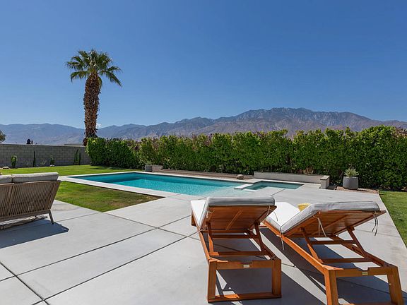 Welcome to El Rancho Vista Estates, one of Palm Springs' most desirable and architecturally significant neighborhoods. This beautifully renovated 3-bedroom, 2-bathroom home on an 11,326 square foot lot, originally built in 1979, has been thoughtfully updated from top to bottom while staying true to its desert-modern roots. Step inside to find new windows and sliding glass doors that flood the home with natural light and frame the unobstructed, postcard-perfect views of the San Jacinto Mountains to the west. The open and airy floor plan is enhanced with brand-new flooring throughout, giving the home a fresh and cohesive feel. The bathrooms have been fully remodeled with modern fixtures, finishes, and a clean, contemporary style, offering a spa-like experience. The centerpiece of the backyard is a brand-new sparkling pool and spa, perfect for lounging under the warm desert sun or entertaining guests in the evenings. The outdoor space has been designed for low maintenance living so you can focus on relaxation and fun. Situated just minutes from downtown Palm Springs, you're never far from world-class dining, boutique shopping, art galleries, and vibrant nightlife. The home also offers quick access to I-10, making weekend getaways or commutes east or west simple and convenient. Whether you're looking for a full-time residence, a seasonal escape, or an income-producing vacation rental, this property checks all the boxes. Welcome Home!