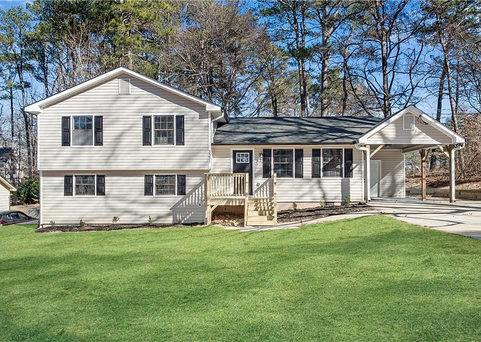Fully updated 3 bedroom 2 bath open home on a large level lot w/ covered parking! Charming curb appeal features a new roof, new front porch deck, new gutters & downspouts, painted exterior w/ shutters, & new outdoor lighting. This home has all new flooring and new interior paint throughout! Vaulted open family room & dining room have views to the stunning kitchen w/ beautiful wood ceiling beams giving lots of character. Tons of natural light throughout! Kitchen showcases new white shaker cabinets, quartz countertops, sleek black subway tiled backsplash, new stainless steel appliances, new sink, new fixtures, & black hardware! Kitchen island has extra storage & overhang for bar seating! Dining room has plenty of space for your table and is the perfect place to gather. Convenient carport entrance makes bringing in groceries a breeze! Head upstairs to find the primary suite w/ new carpet & beautifully designed private primary bathroom featuring new vanity, new mirror, new lighting, & walk-in tiled shower. Two additional guest bedrooms share the matching full hall bathroom w/ double vanity, new mirrors, new lighting, & tiled tub & shower that also has easy access for any visiting guests! Back on the main level take the stairs next to the kitchen down to the unfinished terrace level that has the laundry connections & several rooms that are perfect for storage now or can easily be finished to suit your needs in the future. There is a sliding glass door here that leads to a side concrete patio with access to the backyard. Flat & level backyard has room to run & new seed & straw all with easy access to the driveway! Carport has a finished storage room for any tools & yard equipment. Driveway has extra parking pad. This home is complete with new carpet in bedrooms, new lighting, new fans, new plumbing fixtures throughout, new water heater, new roof, and a new HVAC giving you a piece of mind for years to come! Located near all the shopping & restaurants, the neighborhood is off Old Peachtree Rd and only a few miles drive to I-85.