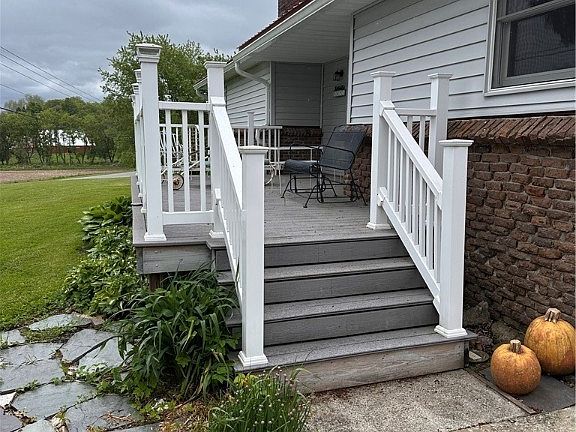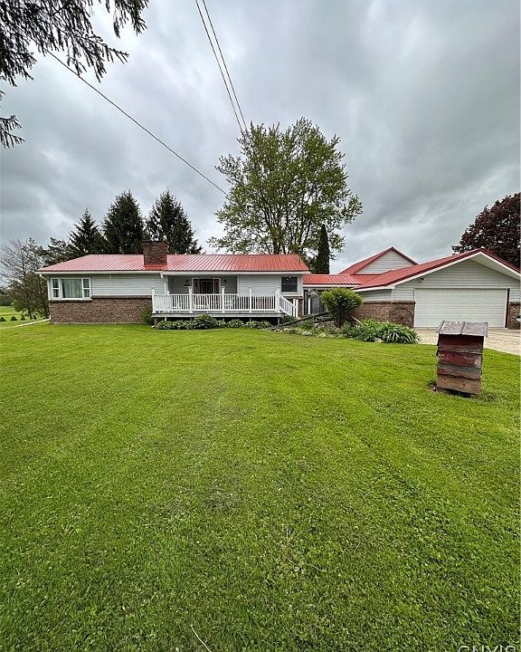 Easy, one level living in this country ranch sitting afront 7 green acres of countryside offering pretty green views. Double wide concrete driveway offers 2 car garage w. attached barn on back side of it offers loft and stone floored storage or shop space. A country-perfect breezeway connects the garage to the house with front and back doors to take you where you want to go! Walk into a spacious eat in kitchen, pass through a dining room area and into a huge living room with great windows and brick fireplace wall, currently hosting a wood stove. A long hallway delivers you to three bedrooms; the primary with a private showered bath and double closet & hardwoods; the middle bedroom that looks out on back yard and the third bedroom currently used as a laundry room (see photos). The washer and dryer could easily go back downstairs to the laundry room area in basement complete with sink and cupboards. A wonderful country property offering great elbow room and convenient location; a few miles into Hamilton or Madison.