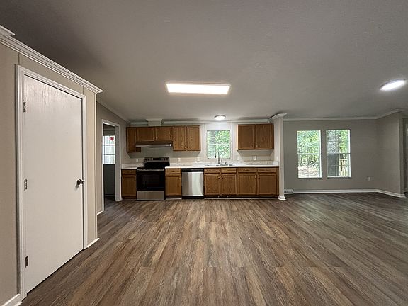 This large home in Madison, GA hosts four large bedrooms and three full bathrooms. Just inside is the open concept living room with the kitchen in the back. If more sitting room is needed, there is a den off the dining nook with access to the back deck. The primary bedroom is on one side of the house with the three other bedrooms on the other side. The peaceful property has over 4 acres of land and a private backyard. Utilities and lawn care are not included in rent.