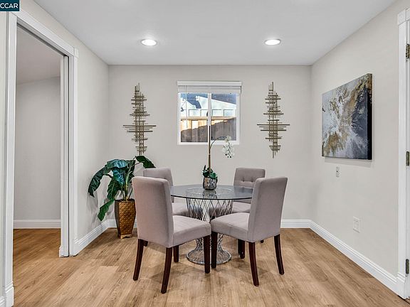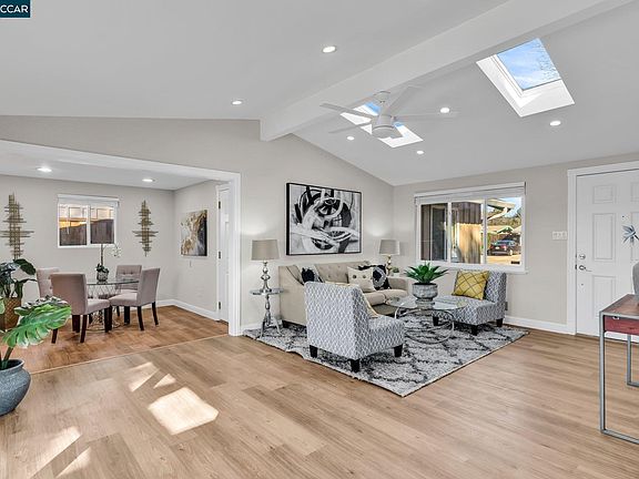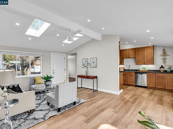 Discover this inviting single-story home nestled in Concord’s Holbrook Heights neighborhood. Enter to find modern luxury vinyl plank flooring and recessed lighting that create a sleek, contemporary ambiance throughout. Bright and airy living room features vaulted ceilings, skylights, and sliding door connects to a spacious backyard. Versatile flex space adjacent to the living room offers endless possibilities for dining or additional living, complete with a convenient laundry room. The kitchen perfectly balances timeless appeal and practicality with shaker-style cabinets, a breakfast nook, and a gas range. Three comfortable bedrooms showcase wood-beam ceilings, mirrored closets, and ceiling fans, all sharing an updated bathroom. Outside, enjoy the expansive backyard with a patio, pergola, mature trees, and plenty of space for entertaining, gardening, or relaxation. The attached garage, with built-in shelving, provides added convenience. This home is located near an elementary school, the Holbrook Heights community pool, and BBQ area. Nearby attractions include Pixie Playland, Willow Pass Park, sports courts, and shopping and dining in downtown Concord. Conveniently located near commuter routes and 2 BART stations, this home offers a perfect balance of comfort and accessibility.