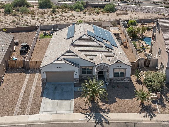 Welcome to this spacious, original-owner gem located on an oversized homesite backing a serene desert wash, offering 4 bedrooms and 3 baths within 2,684 sq ft of well-designed living space. The open floor plan boasts a great room with an inviting electric fireplace, a formal dining area, & a charming den framed by stylish barn doors. The gourmet kitchen dazzles with two-tone cabinetry, granite countertops, subway tile backsplash, stainless steel appliances, a walk-in pantry, and a center island with breakfast bar and pendant lighting-perfect for entertaining. Expansive multi-panel sliding doors seamlessly connect to a pergola-covered patio & a generous backyard featuring an outdoor kitchen, above-ground spa, a fully wired ''she-shed,'' low-maintenance landscaping, stunning mountain views, and complete privacy with no backyard neighbors. The oversized primary suite impresses with a custom barn door entry, dual sink vanity, separate tub and shower, and an expansive walk-in closet, while a secondary bedroom offers its own private en-suite bathideal for guests. Additional highlights include elegant stone exterior elevation, an RV gate, a 2-car garage with epoxy flooring, and leased solar panels that provide valuable utility savings. All this just a short stroll from the vibrant Tartesso Sports Park, combining comfort, style, and location in one irresistible package.