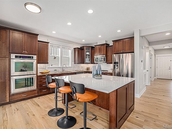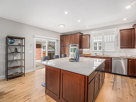 Have you ever wanted a Denver Square in a great Denver neighborhood? This classic full brick 2 story is almost new again, with refinished wood floors, all new carpet, lighting, interior paint, back splash tile, expanded island with quartz, roof and mulch in the yard. The large front porch is the place to hang out with a cup of coffee in the morning, talking to the neighbors as they walk to the park. The formal dining room is across from the 4th bedroom, on the main floor, with beautiful French doors. This could be used as a private office space. The 3/4 bath was upgraded with the builder. The heart of the great room is the extended island with a beautiful quartz counter top. Everyone hangs out around the island and this one is beautiful. The cherry kitchen cabinets are set off with modern back splash tile and rich granite counter tops. The KitchenAid appliances include a double oven, gas cook top, range hood, microwave oven, refrigerator and dishwasher. This room gets great light, year round, with southern & western exposure. The upper level has a generously sized primary suite with a coffered ceiling, plenty of LED lights and space for large bedroom furniture. The bathroom has two separate vanities with granite counter tops, a large soaking tub, a separate shower and huge walk-in closet. The laundry, 2nd & 3rd bedrooms and full bath complete this level. The basement is unfinished and ready for future finish. There is a patio between the house and the garage, with a natural gas hook up. The backyard is fenced and secure. Great location. One house from Central Park. Close to light rail, Denver Rec center, grocery, shopping and restaurants.