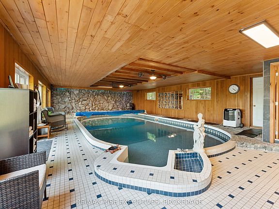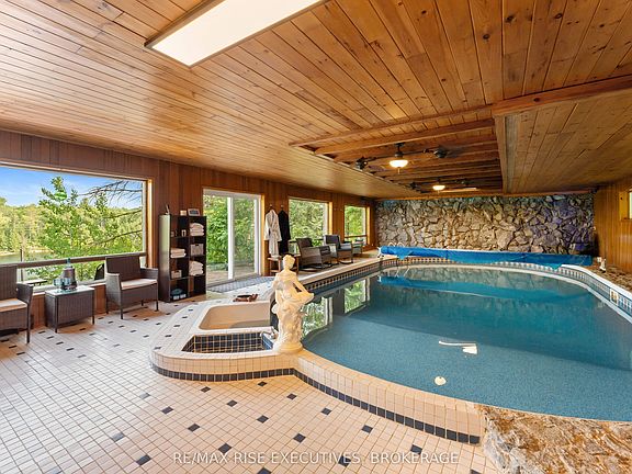 Hidden beyond a winding driveway, framed by towering trees and natural forest, this exclusive 6.8 acre estate redefines luxury and seclusion. As you approach, you pass your own private tennis and pickleball court, a fully fenced dog run, and a rustic triple-car garage, all nestled within a pristine landscape that feels worlds away from the everyday. The home itself is a masterclass in rustic elegance blended with modern comfort. With no visible neighbours and no hint of road noise, it's a sanctuary of pure privacy overlooking deep, crystal-clear waterfront. The expansive indoor pool, bathed in natural light and perfectly positioned to take in tranquil water views, invites year-round indulgence. Inside, the layout is designed for both intimate living and grand entertaining, boasting over 3,500 square feet including the pool. The main floor features a warm and inviting bar area, an open-concept kitchen with generous proportions, and a regal dining space that flows effortlessly for gatherings. Upstairs, three bedrooms offer serene retreats, while the lower level hosts two additional bedrooms, making the home ideal for families or guests. From early morning swims in the clear, spring-fed lake to leisurely games of pickleball, or watching your dogs explore the acreage, life here is defined by possibility and peace. Every detail from the forest trails to the indoor pools soft reflections echoes luxury and privacy in perfect harmony. This property offers a rare versatility: an extraordinary primary residence, a multi-family retreat, or an opportunity for visionary buyers to explore boutique commercial uses such as an exclusive wellness resort or additional living accommodations on the grounds.