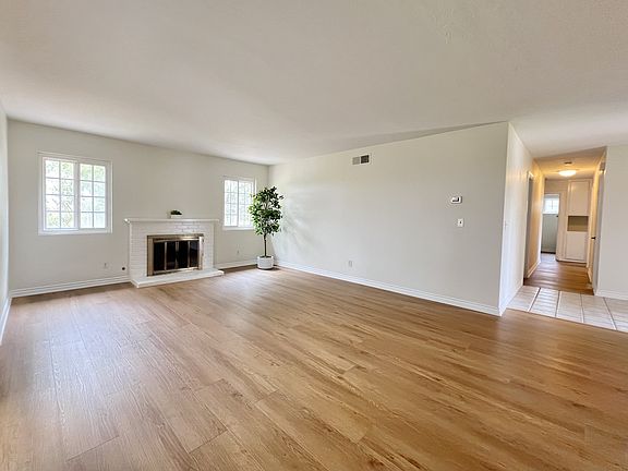 The homes spacious living room features a fire place and sliding doors that lead to the fully enclosed California room and large back yard.
