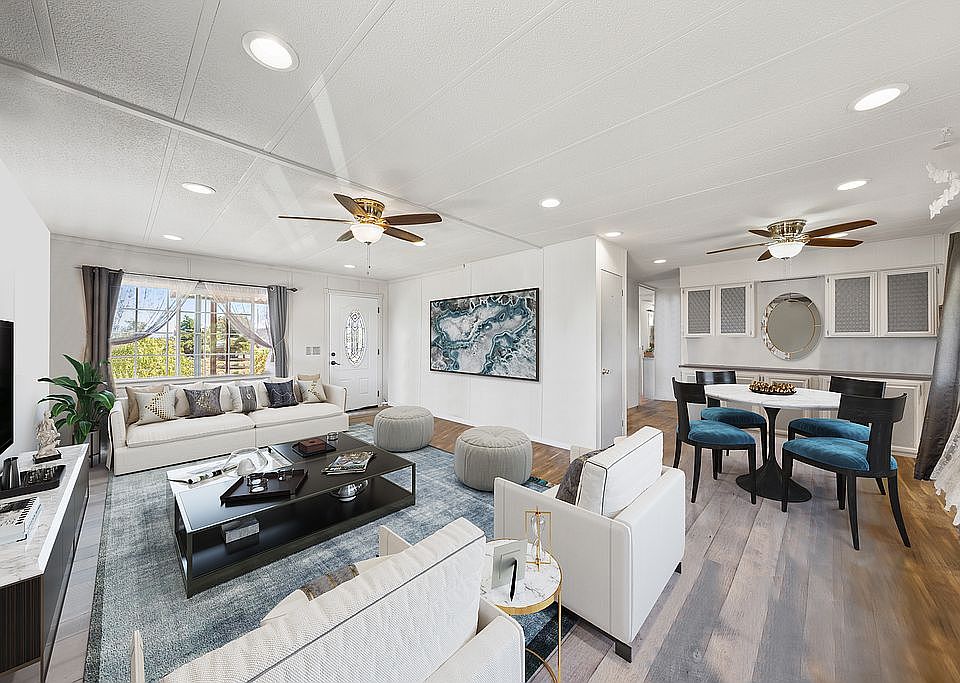Charming mobile home on 2.54 acres available in the wonderful community of Menifee! Upon entering the home, you are directed right into a wonderful layout that is accented by bright natural lighting, laminate flooring, a large built-in offering more storage space and ceiling fans. The open kitchen offers wood cabinetry and spectacular views of the mountains from the windows. The bedrooms are both spacious with the master bedroom being a homeowners retreat. Moving outside you'll find a large yard which offers a water well, leased propane tank and two RV hookups. With lots of space to entertain or relax, this home won’t last long so make it yours! *some photos have been virtually staged*