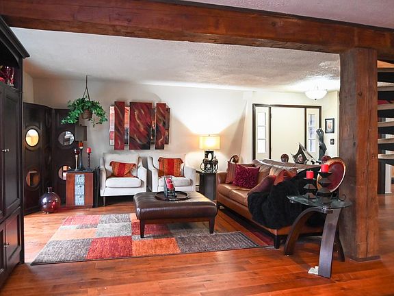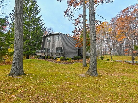 Peace and tranquility in this modified A-frame home on 1.28 wooded acres with a pond and on a quiet cul-de-sac. Many updateds including a new boiler, newer roof, new vinyl cedar shake siding and freshly painted exterior. Spacious living room, with gas fp and built in wet bar and patio door to deck overlooking the pond. First floor laundry. Primary bedroom with doors to deck. Kitchen with access to third deck. First floor laundry. Home is being sold as-is.