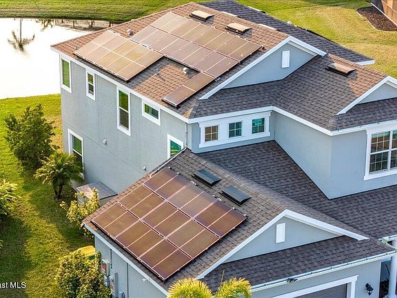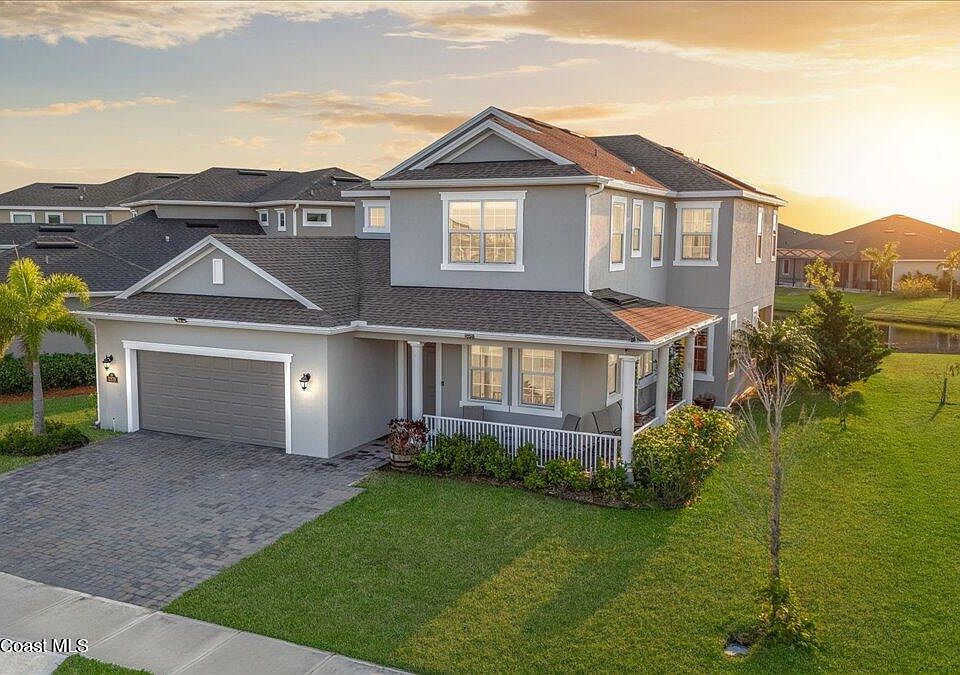 Meticulously maintained Acacia floor plan in the Viera Community of Sierra Cove with 4 bedrooms, 3.5 baths, and stunning lake views from both the front porch and rear patio. This energy-efficient home features fully paid SOLAR PANELS for low monthly utility costs. The open-concept layout includes wood-look tile throughout, high ceilings, and 8' doors. A flex room on the main floor is ideal for a home office or 5th bedroom. The kitchen offers 42'' white cabinets, granite countertops, subway tile backsplash, stainless steel appliances, gas range, oversized island, and walk-in pantry. Spacious dining area opens to a large covered lanai—perfect for entertaining. Upstairs, the owner's suite features tray ceilings, dual walk-in closets, and a spa-style bathroom with dual vanities and a large walk-in shower. Three additional bedrooms, two full baths, and a laundry room complete the second floor. Climate-controlled 2-car garage with workshop space. Located in sought-after Addison Village with access to resort-style amenities: pools, tennis, pickleball, basketball, and more.