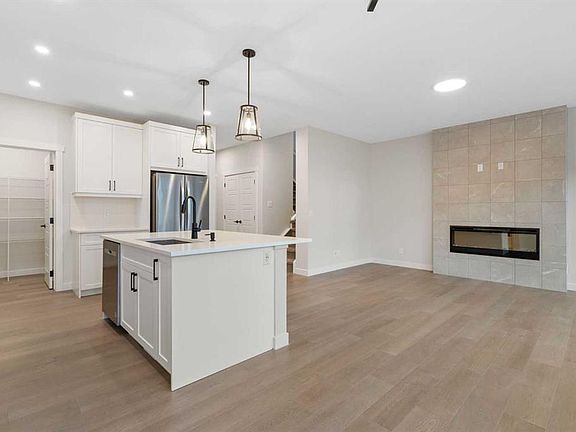 Open concept kitchenGas rangeAmple counter spaceLarge pantrySpacious islandInviting electric fireplaceLuxurious ensuite
