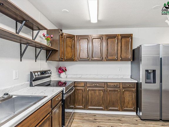 This studio-style layout with an open-concept design offers a cozy and efficient living space surrounded by nature. Enjoy the perfect blend of privacy and accessibility—ideal for Aurora viewing or peaceful year-round living. Outdoor amenities include a fire pit area, a heated outhouse with lighting, a wraparound driveway for easy access, and covered storage in the back. The home has been recently remodeled with all-new matching appliances, including a smart Wi-Fi oven, stainless steel sink, HE stackable washer and dryer, and a new Toyo heater. Additional upgrades feature a 600-gallon water holding tank, new vinyl flooring, and wiring for cameras and a security system with exterior lighting. The yard can easily be fenced—perfect for dogs! Book a showing today!