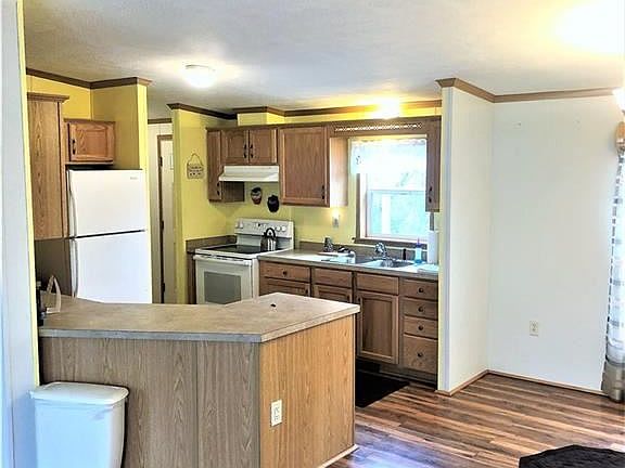 One level living on 6 year young house!!!! This ranch is set up for convenience. Easy to maintain laminate flooring in the spacious living room with an open floor plan including a dining room and kitchen with a built in island! Kitchen comes with refrigerator and stove, ready to move right in! All rooms have large newer windows allowing for natural light. There is a laundry and mud room located right off the kitchen with a separate sink for easy convenient clean up. Washer and dryer are included!! Two large bedrooms each with double closets, are on each side of the house, one with custom built in cabinets that would make an excellent office. Bathroom is set up to be easily accessible and conveniently located off the living room and close to bedroom. The exterior of the house is just as ready to go, fenced in yard!! Front and rear deck!! and comes with a storage shed as well!! Don't miss out on this awesome ranch home.....with a basement for extra storage possibilities!!