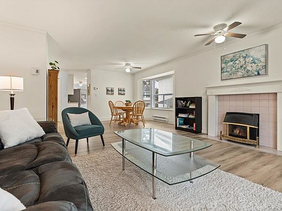 Welcome to Forest Edge! A quiet 55+ community backing onto parkland. This upper floor unit shows like new! Spacious & bright with 2 bedrooms/2 full bathrooms, gas fireplace, air conditioning, open layout living/dining area plus kitchen nook. Large primary bedroom with beautiful full ensuite. Thoughtfully updated for low-maintenance living. Updates include: flooring, baseboards/controls, appliances, heat pump with two mini-splits, updated lighting, ceiling fans, and refreshed bathrooms. Enjoy morning sun from the large east-facing balcony with forest views. Rentals allowed, one cat or dog permitted (14" at shoulders), two parking stalls (one covered). Close to shopping, parks, and recreation. Must be seen to be appreciated. Nothing to do here, but move in and enjoy! Book a showing today!