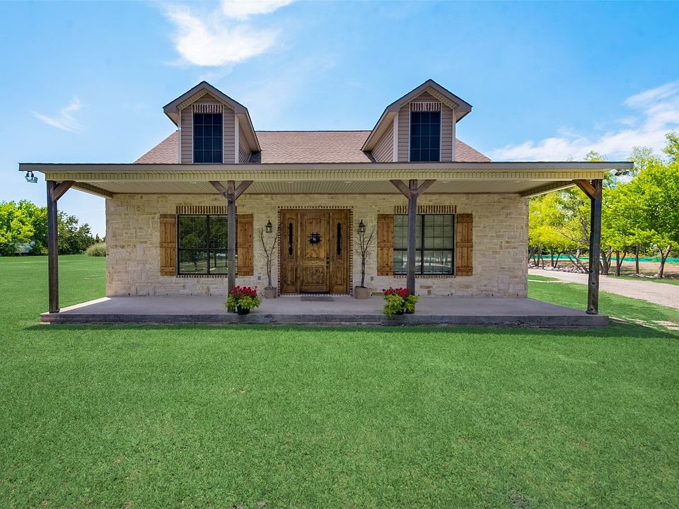 Rustic charm abounds in this ranch style one owner home on just over two tree lined acres with a gorgeous wood beamed covered porch and oversized covered back patio to sit and enjoy those country mornings and picturesque views. Through the solid wood door, the fabulous stained concrete flooring leads you into the home and into the kitchen with custom cabinetry, stone backsplash, coffee bar and then onto the spacious family room, dining room and office with stone accent wall and built in desk. First floor also houses the master bedroom with walk in closet, fabulous backyard views and lovely master bath with granite vanity and framed mirror along withe a second bedroom down. Upstairs offers a very large second living perfect for game or additional living area along with two spacious secondary bedrooms and full bath.