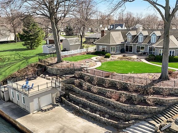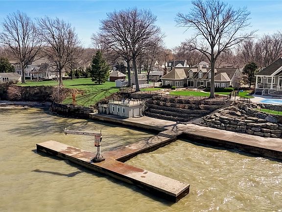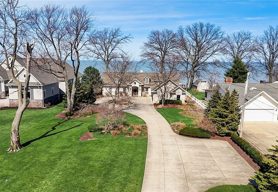 Experience Lakefront living in this exquisitely crafted custom Cape-style home boasting unparalleled lake access. Embrace the vacation lifestyle every day with a pier, dock, boat hoist, and boat house perfect for your waterfront dreams! Delight in the meticulously landscaped surroundings, with stone steps, retaining wall, and sturdy break-wall leading to endless days of lakefront activities, from kayaking and jet skiing to paddle-boarding and beyond. Step inside to discover sun-filled interiors with coastal charm, accentuated by vaulted ceilings, an open floor plan, and soothing neutral tones. The family room enjoys floor-to-ceiling windows, vaulted ceilings, and a dual-sided fireplace, seamlessly flowing into the expansive dining room, ideal for hosting gatherings. The kitchen, featuring a cozy fireplace, granite island, custom cabinetry, pantry, and built-ins, connects to a delightful breakfast room offering panoramic views. An inviting office offers more panoramic Lake Erie views. Retreat to the luxurious master suite boasting sweeping lake views, his and hers closets, and a spa-like ensuite complete with dual vanities, a soaking tub, and a walk-in shower. Two additional generously sized bedrooms on the main level each feature their own ensuite bathrooms, complemented by convenient first-floor laundry facilities. Upstairs discover a spacious bonus room perfect for recreation, along with a spacious guest suite featuring a full bath. This exceptional residence embodies the essence of comfortable and rejuvenating lakefront living, promising a lifestyle of unparalleled tranquility and leisure.
