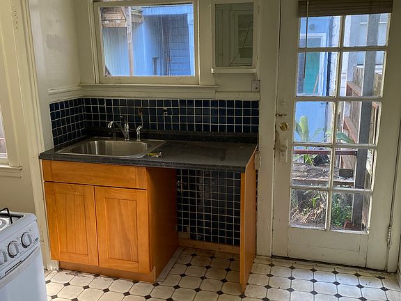 Small Victorian House. A standalone structure away from the street at the rear of a three-unit building. It has one central room with a separate kitchen, bathroom, and walk in closet. There is wooden floor in the room and closet. The bath and kitchen have linoleum. There is a porch and small garden area. The house is separated from the front building by a cement area.