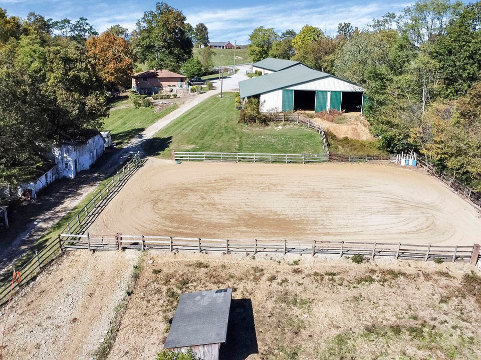 Incredibly *RARE* opportunity to own a fully equipped equestrian facility in Union, KY — or to create the income-producing property or homestead of your dreams! The possibilities are endless with this nearly 23-acre property, featuring a lighted indoor riding arena with viewing room, two barns offering a total of 28 large stalls, a spacious hay loft for storage, outdoor riding arena, fenced pastures, additional outbuildings, pond, creek, and a three-bedroom brick ranch home with a walkout basement.
