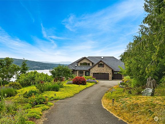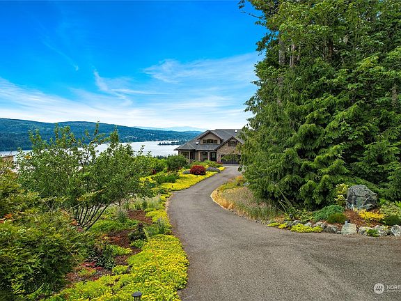 TOP OF THE WORLD! Whatcom County's most spectacular views & sunsets overlooking Lake Whatcom, Bellingham & the San Juan islands. Situated on 5 acres in a private gated community with 500 feet of no bank waterfront with a dock & boat ramp on Lake Whatcom. This is a high-end quality custom built one owner home with almost 6,000 square feet with the primary bedroom & other living areas on the main floor. Room sizes are spacious with high ceilings. The list of features is endless & include everything you would want or need, including solar panels, zoned heating with air conditioning, automated shades, & so much more. Enjoy the fenced raised garden, multiple fruit trees, multiple heated garages, each with its own shop. Yes, it's SPECTACULAR!