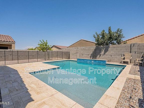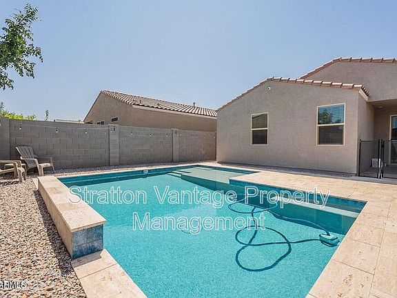Through sliding glass doors, discover your own backyard oasis. The private fenced pool boasts travertine decking, a modern baja shelf, and plenty of room to lounge or host gatheringsall while enjoying Arizona's sunshine year-round.