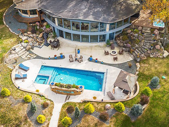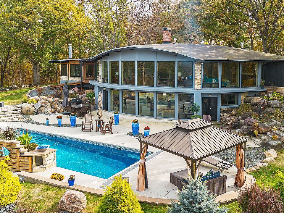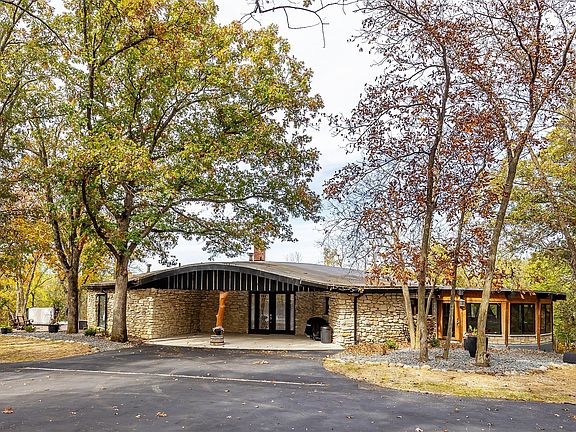 Executive retreat on nearly 4-acres of wooded land just a quick jump from the metro. This architectural marvel has a mid-century design with locally sourced woods and limestone. In addition, you will find custom alder cabinetry, unique brickwork, and amazing stone archways. You will find floor-to-ceiling windows across the back of the house overlooking your wooded land and fantastic pool area. Enter the home through double doors where you will find a beautiful, brick spiral staircase, large kitchen, dining room, amazing great room with wood ceiling and custom fireplace; and a sunroom that is surrounded with new Pella windows, unique fireplace, heated tile floor, bookshelves, and a stunning wood ceiling. Also on the main is the private primary suite filled with windows, dressing room, bathroom with both jetted tub and tile shower, and a walk-in closet. Descend to the lower level through the beautiful spiral staircase to a gorgeous wet bar with all the appliances needed to entertain, two additional bedrooms and a full bathroom. Perhaps the most amazing part of this unique property is on the outside. Amazing pool area surrounded by patios, covered pergola, two water features, fire pit, separate deck area with hot tub, and a nearby shed for all your pool equipment and toys. Over 4,300sf of living space, 3 fireplaces, concrete construction, geothermal heating/cooling 'a one-of-a-kind masterpiece in your own private wooded sanctuary.