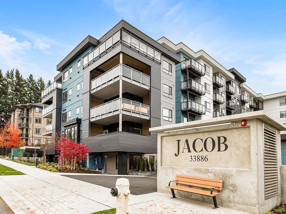 YOUR OPPORTUNITY TO OWN A BRAND NEW CONDO! This Jr. 2-bedroom ground floor unit at Abbotsford's JACOB Complex is brand new and move-in ready at the end of Summer. Situated nearby Historic Downtown Abbotsford and the Rail Disrict - everything you need is in walking distance or a short drive: Mill Lake Park, Seven Oaks Mall, Abbotsford Centre, UFV, Costco and 4 minutes from all levels of school. Designed by reputable Redekop Faye; the JACOB is timeless and low maintenance; with manicured courtyard 'The Gathering Place' and family friendly playground. Unit 115 includes: high end appliances, upgraded Laminate flooring throughout main living space and both bedrooms, 1 parking (truck size), 1 storage unit, and is in the "Light" Colour Scheme, with easy first-floor access for pets and kids!