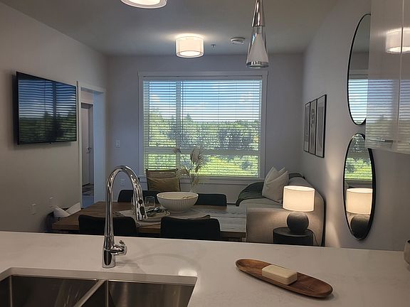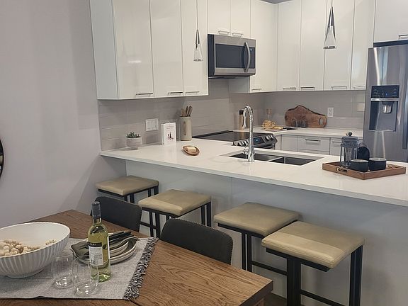 Premium finishes: quartz countertops, stainless-steel appliances, in-suite laundry
